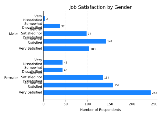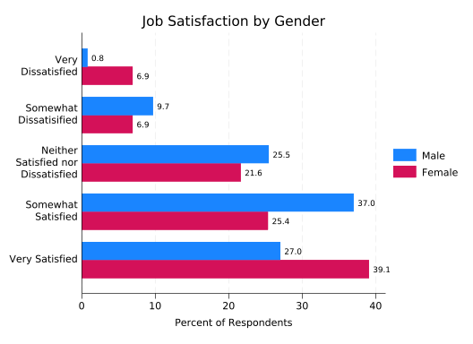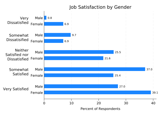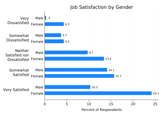 The latter form makes for easier comparisons between males and females. But in this case the only thing you can easily learn by comparing them is that more females answered the survey than males. It would be much more useful to look at what percentage of males and females are in each satisfaction category. Unfortunately, just telling graph hbar to plot percentages doesn’t do that: