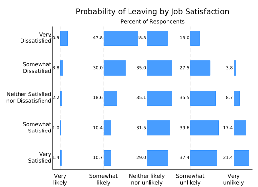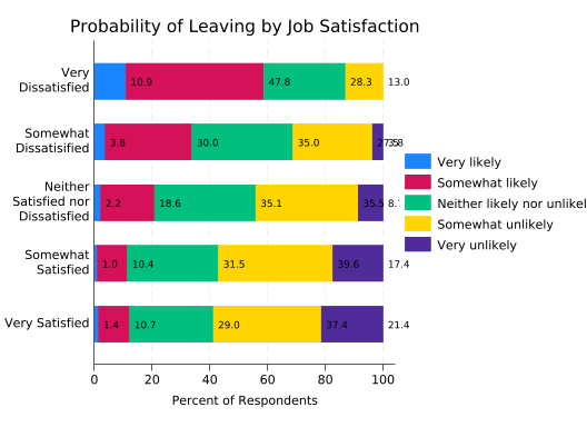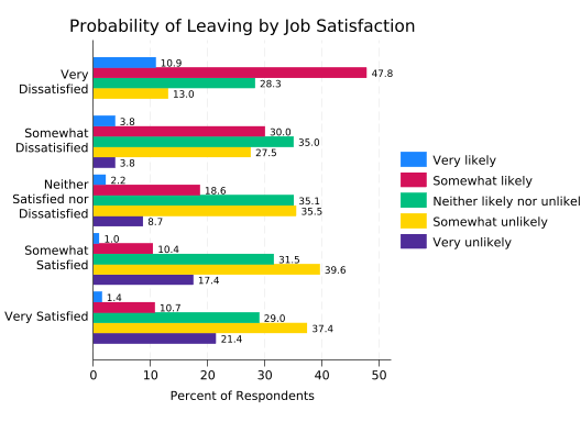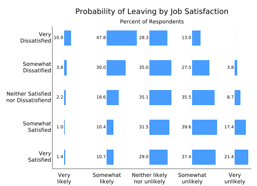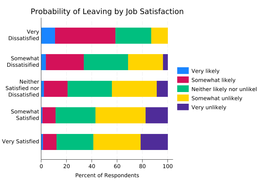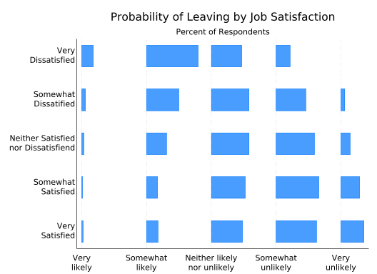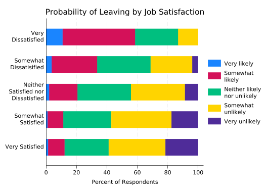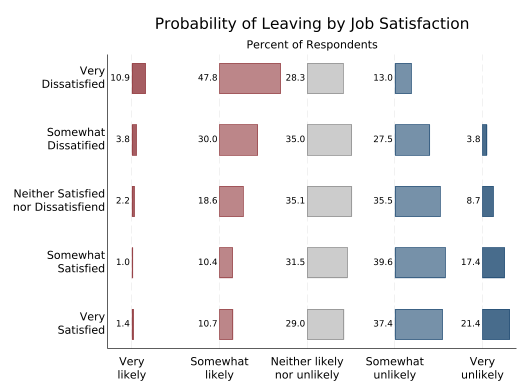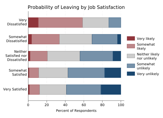 The disadvantage of this graph is that it’s almost impossible to answer questions like “Which group has the most people who are neither likely nor unlikely to leave?” short of getting out a ruler. That can be fixed by giving each of the stacked bars a separate y axis.