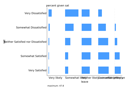 If you stare at this long enough you’ll see that higher levels of satisfaction are associated with a lower probability of leaving, but it takes some real effort. The relationship is much easier to see if the bars are stacked.