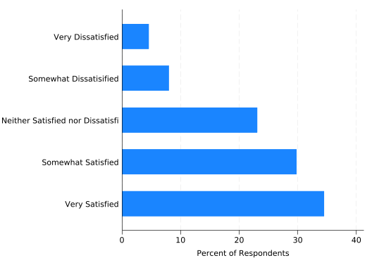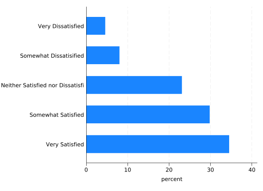 There are two problems with the bar labels, however. One is being covered up by the legend, and that could be fixed. But the last two labels for “Somewhat Dissatisfied” run together because the final bar is so small. That’s not easy to fix, so just remove the labels. You still need percent(sat) though, as the lengths of the bars are still percentages calculated over satisfaction categories.