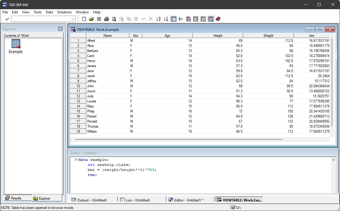 This creates a new data set, example, by reading observations from an existing SAS data set, class, and creating a new variable, bmi, based on the height and weight data in the class data. The log assures us this code ran, producing a data set with 19 observations and 6 variables.