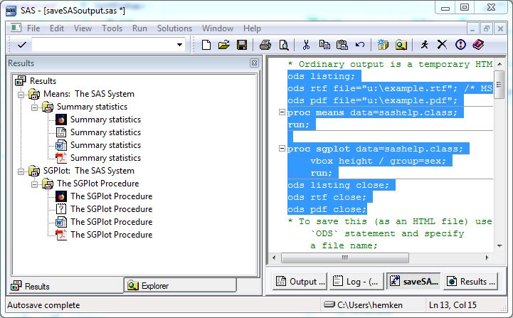 As you work in SAS or SAS Studio, the statistical tables and graphs output by your SAS procedures are displayed in the Results Viewer and stored in a temporary HTML file. This is good for day-to-day data exploration and code development.