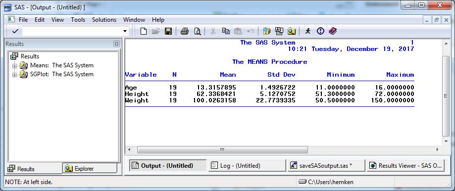 You may prefer plain text (“listing”) output. This is saved automatically when you run SAS in batch mode. We generally recommend batch mode if you want to save simple output.